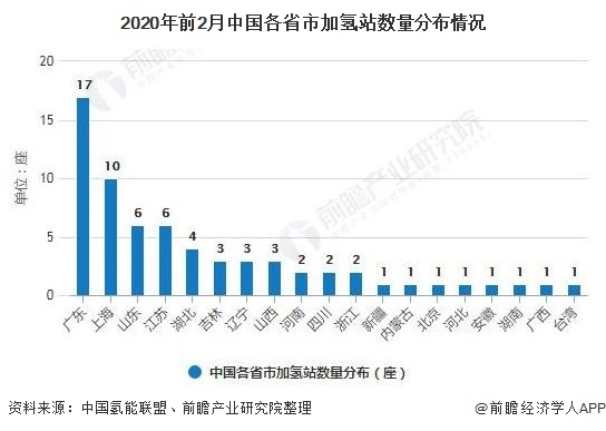 值得注意的是,中國加氫站數(shù)量雖有迅速增加,截至2020年2月,我國加氫站共有66座,仍有較大上升空間。廣東省以17座的數(shù)量排在首位,其次是上海市,擁有10座加氫站。