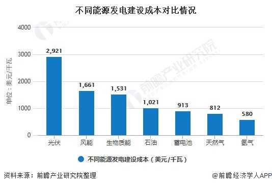 從不同能源的燃油熱值與發(fā)電建設(shè)成本方面考慮,氫能源均具優(yōu)勢。從燃料熱值角度看,氫能源高于天然氣、汽油、煤和乙醇等其他能源。氫氣燃料熱值幾乎是其他化石燃料的3倍多。從發(fā)電建設(shè)成本來講,氫能源發(fā)電建設(shè)成本最低。 EIA數(shù)據(jù)顯示,氫氣發(fā)電建設(shè)成本僅580美元/千瓦,在光伏、風(fēng)能、天然氣、 生物質(zhì)能、石油發(fā)電等眾多方式中成本最低。