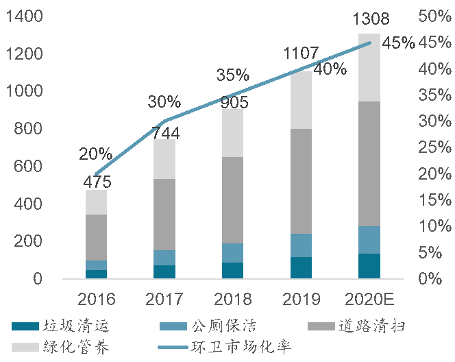 圖表1 2016-2020年全國環(huán)衛(wèi)市場(chǎng)化空間規(guī)模及市場(chǎng)化率測(cè)算