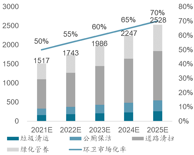 圖表3 2021-2025年全國環(huán)衛(wèi)市場(chǎng)化空間規(guī)模及市場(chǎng)化率預(yù)測(cè)