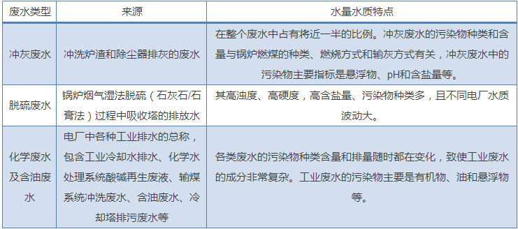 電廠廢水來源廣泛,主要分為以下幾類:沖灰廢水、脫硫廢水、工業(yè)廢水(化學(xué)廢水及含油廢水)。與化工、造紙等工業(yè)廢水相比,火電廠的廢水有以下特點:水質(zhì)水量差異很大,劃分的廢水的種類較多;廢水中的污染成分以無機(jī)物為主,有機(jī)污染物主要是油;間斷性排水較多。電廠廢水來源及水質(zhì)特點總結(jié)于下表。