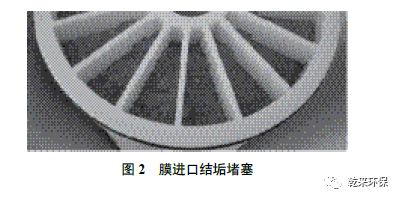 為減少蒸發(fā)量,部分廠家采用RO 膜技術(shù)進(jìn)行濃縮。煤化工廢水TDS濃度約為3 000 mg ˙ L-1,硬度約為300 mg ˙ L-1,COD 約為300 mg ˙L-1。在高濃縮比的工況下,長時(shí)間運(yùn)行會對膜進(jìn)口和膜面產(chǎn)生污染。因此需投加藥劑除硬,增加了污泥外置費(fèi)用。卷式RO 膜無法進(jìn)一步提高濃縮比的主要原因有兩個:第一是卷式RO 膜的進(jìn)入通道較窄,第二是其膜面剪切力不足。RO 膜進(jìn)口結(jié)垢堵塞情況見圖2。