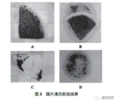 由表1 和表2 可知,震動膜產(chǎn)水水質(zhì)滿足回用要求,但膜通量和清洗周期還未達(dá)到設(shè)計(jì)標(biāo)準(zhǔn)。圖8 為膜面在清潔前后的觀察結(jié)果。