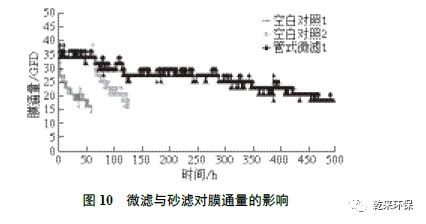 在砂濾前SDI 非常高,砂濾前后沒有太大分別。微濾后SDI 下降明顯,表明污染物直徑范圍在0.01~5 μm。該項(xiàng)目現(xiàn)場進(jìn)行了一次針對前處理的中試。震動膜對砂濾后的產(chǎn)水的處理效果作為空白對照實(shí)驗(yàn)。對比實(shí)驗(yàn)為在進(jìn)膜前設(shè)置微濾單元。圖10為兩次空白對照的實(shí)驗(yàn)結(jié)果與經(jīng)微濾后的震動膜的實(shí)驗(yàn)結(jié)果的對比。
