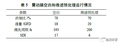 該項(xiàng)目震動膜空白和微濾預(yù)處理運(yùn)行情況比較見表5。